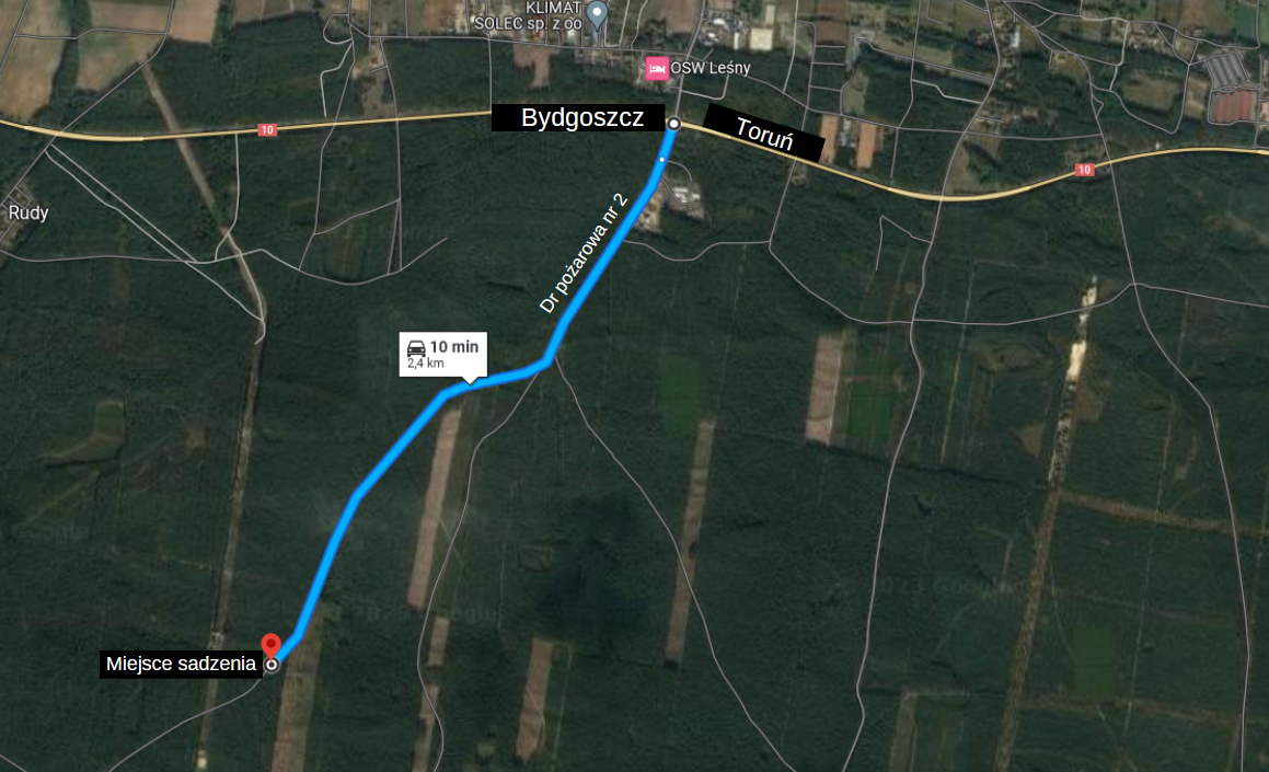 Dojazd na powierzchnię sadzenia: zjazd z S10 w drogę pożarową nr 2, na wysokości zjazdu do Solca Kujawskiego (przy fotoradarze).